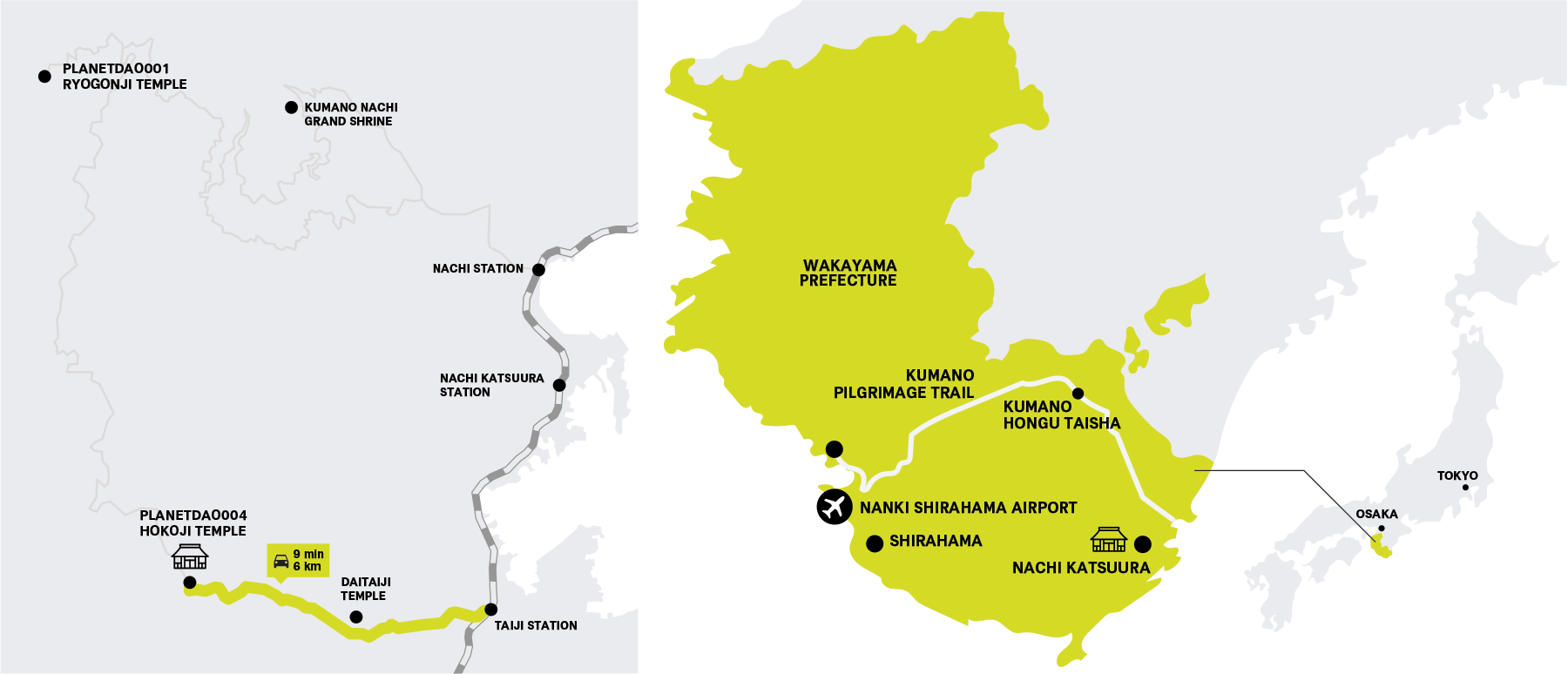 The Kumano Kodo is a network of five ancient pilgrimage routes that weave across the Kii Peninsula, guiding travelers for more than a thousand years. Among them, Hokoji lies along the Ohechi Route — a scenic coastal path once traveled by pilgrims making their long journey to Kumano Nachi Taisha Shrine, where waterfalls, forests, and the sea meet in harmony.